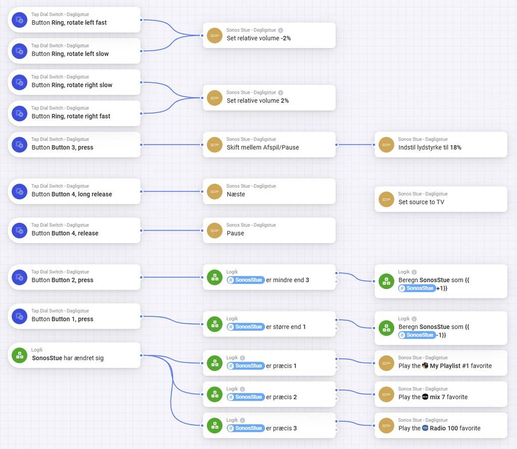 nov 30, 2024 In Homey Pro, Shelly, Smarthome, Sonos Tag Phillips Hue, Sonos, Tab Dial Phillips Hue Tab Dial switch er måske lidt overset i smarthome sammenhæng, men bruger man homey Pro eller HA kan den faktisk bruges til mere end lysstyring, her vil vi se på hvordan vi styrer en Sonos Play. Hvis man nu forestiller sig at de 3 prikker er “play” knappen og de 4 prikker er “Stop/pause” knappen og så er det jo valgfri hvad de sidste 2 knapper bruges til!! i dette eksempel har jeg brugt dem til at vælge hvilken sted vi skal spille fra “favoritter” og “Næste” ligeledes bruges Dial/drejehjulet til at skrue op og ned for lyden, ellers er der er mange muligheder for egne ideer. Jeg vil dog ikke komme ind på Sonos egen app og hvilke steder du trækker dit musik fra. Igen er det Homey Pro vi bruger og da vi har tilføjet Tab Dial fra sidste indlæg, skal vi bare have lagt Sonos app ind i Homey og vi er klar til at programmerer lidt styring. Igen viser det bare at ved at tænke lidt ud af boksen er der mange muligheder for at få et smart home for en pris alle kan være med. Vi kan også lave det lidt mere avanceret for dem der vil mere.. her får vi mulighed for at springe mellem forskellige afspilnings kilder. Her hvordan man forbinder til en gruppe